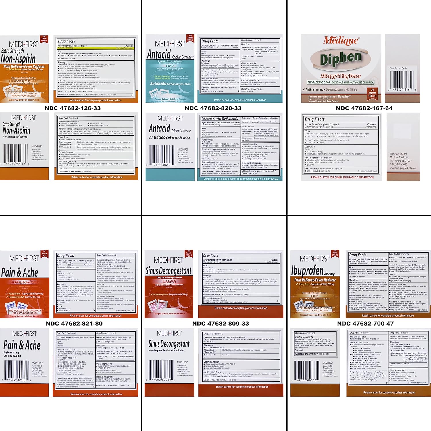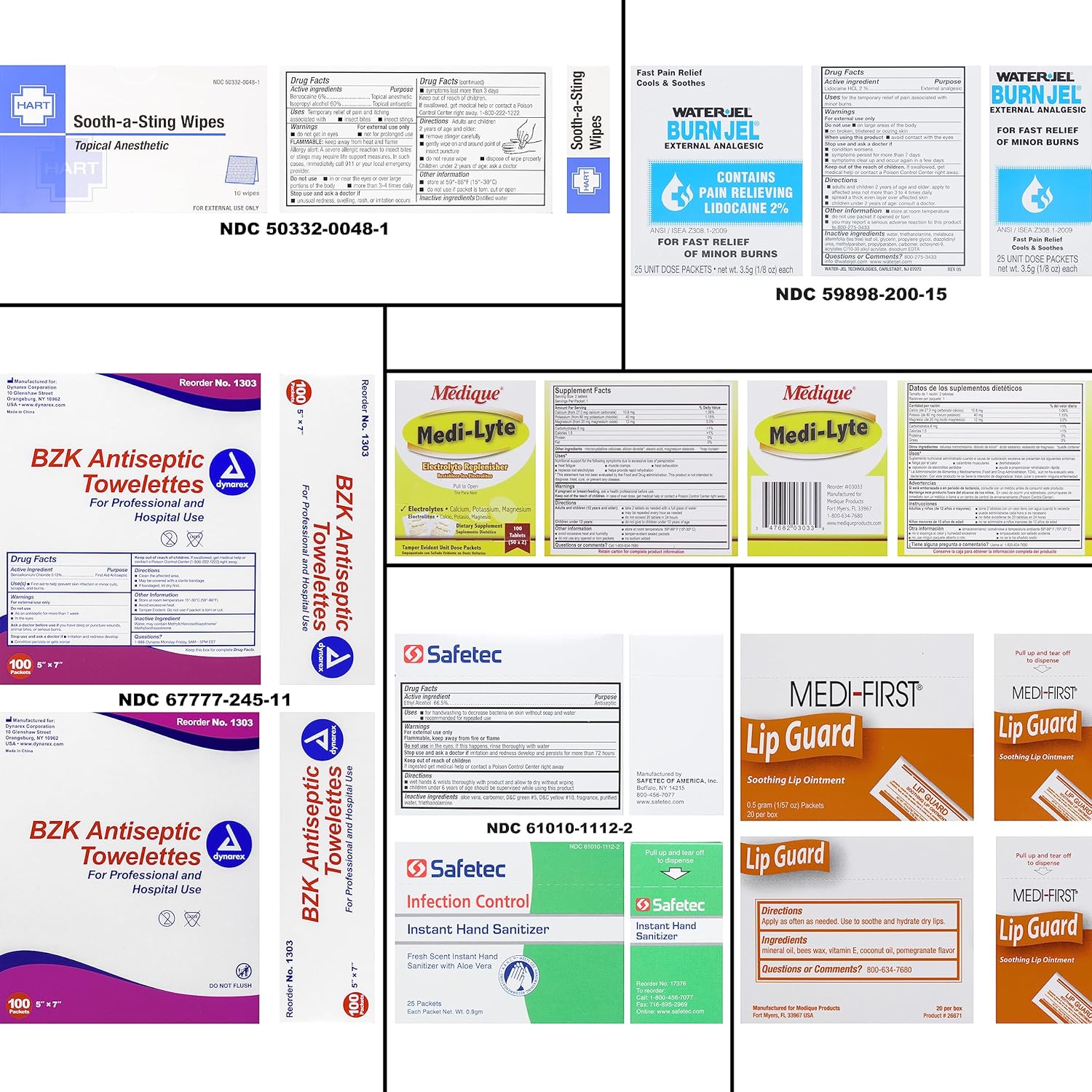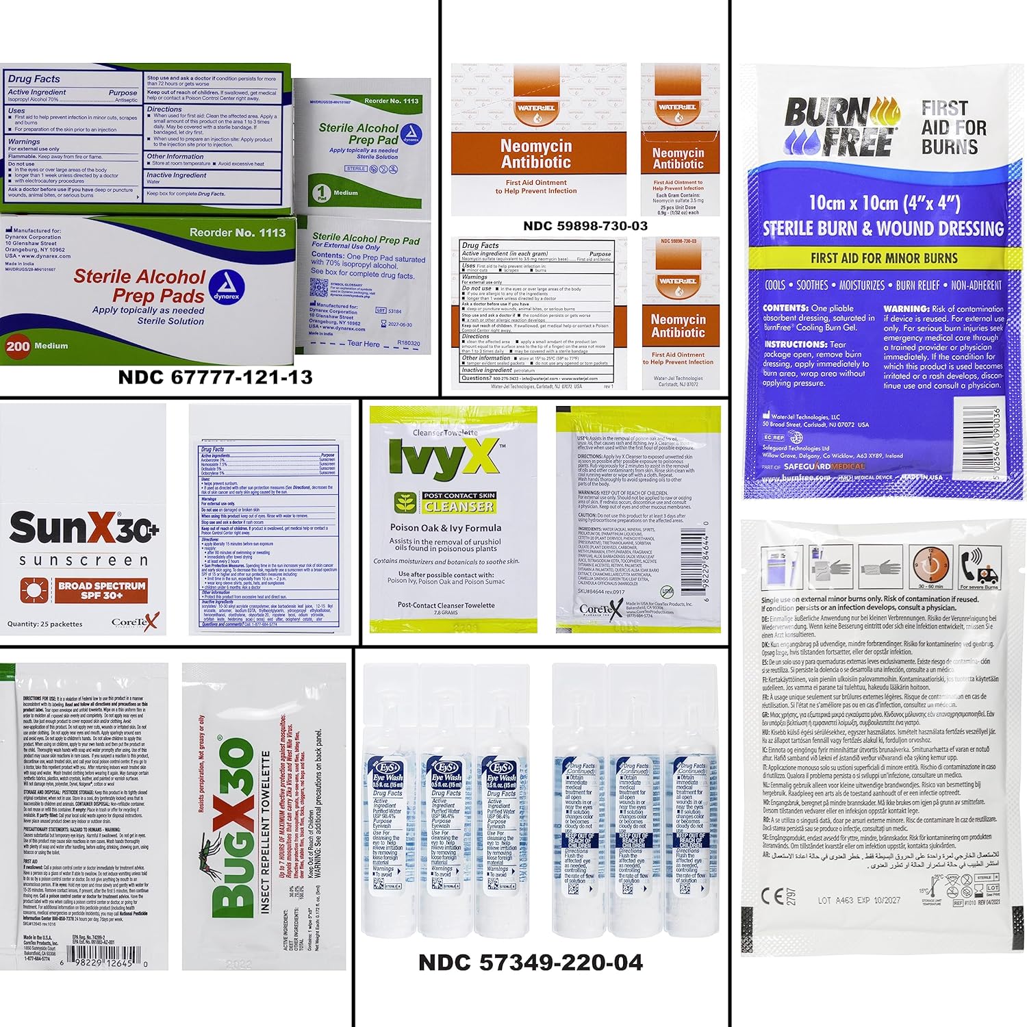 - Included Components : 2 Oval Eye Pads 1 First Aid Guide 2 Pair medical gloves 1 Tweezer 1 Scissor 1 Burn Dressing 4 x 4 1 Triangular Bandage 1 CPR Faceshield 1 Cold Pack 1 Adhesive Tape 1/2 Inch 10 Cotton Tips 2 Pads 3 x 3 2 Combine Surgical Pads 5 x 9 10 Burn Gel Packets 2 Eye Wash 1/2 oz 1 Roll 2 Inch 5 Junior Bandages 3 Spot Bandages 16 Fabric Bandage Strips 3 Butterfly closures 3 Fingertip Bandages 3 Knuckle Bandages 3 Patch Bandages 6 Alcohol Pads 10 Antiseptic Wipes 10 Hand Sanitizer Packets 10 Antibiotic Ointment 6 Sting Relief pads 1 Rescue Blanket 1 Bug X Packets 3 Lip Guard Packets 2 Diphen Packets 1 Ivy Towelette 1 Electrolyte Packet 1 Cool Jel Packet 2 Sunscreen Packet 2 Non Aspirin Packets 2 Ibuprofen Packets 2 Antacid Packets 2 Pain Relief Packets 2 Antihistamine Packets 2 Sinus Relief Packets 2 Oval Eye Pads 1 First Aid Guide 2 Pair medical gloves 1 Tweezer 1 Scissor 1 Burn Dressing 4 x 4 1 Triangular Bandage 1 CPR Faceshield 1 Cold Pack 1 Adhesive Tape 1… See more