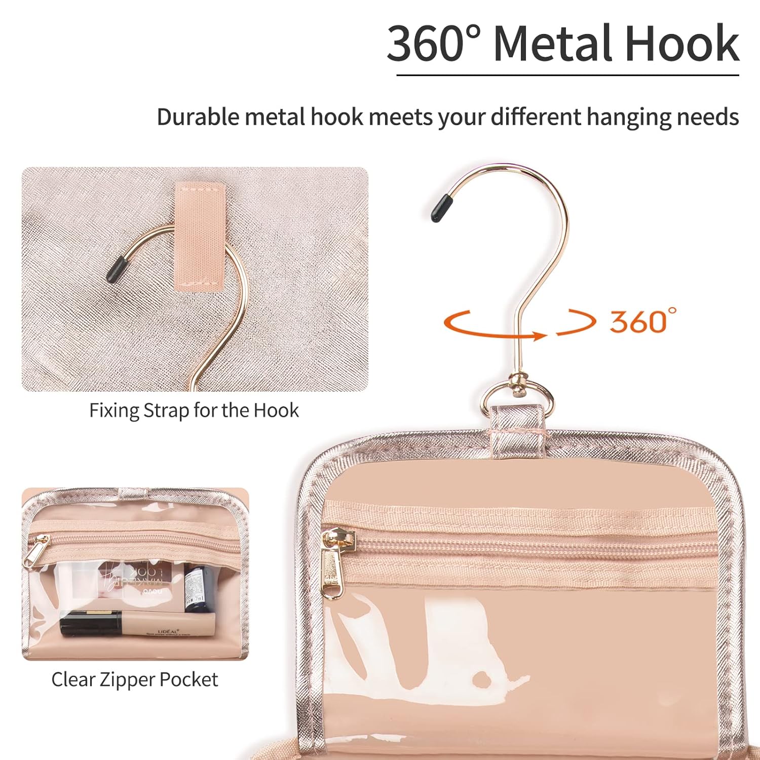 - CONVENIENT HANGING - Hanging toiletry bag for women, stow-away 360 degree swivel non-slip metal hook for versatile hanging options; Two-way zipper closure for quick access; Carry handle doubles as its hanging strap.