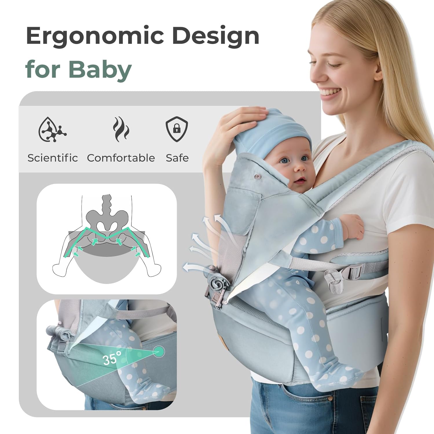 - HANDS-FREE & POSTURE-FRIENDLY:Cook, shop, or chase toddlers while keeping baby snug! The ergonomic hip baby carrier supports posture, eases back pressure, and even aids postpartum recovery.