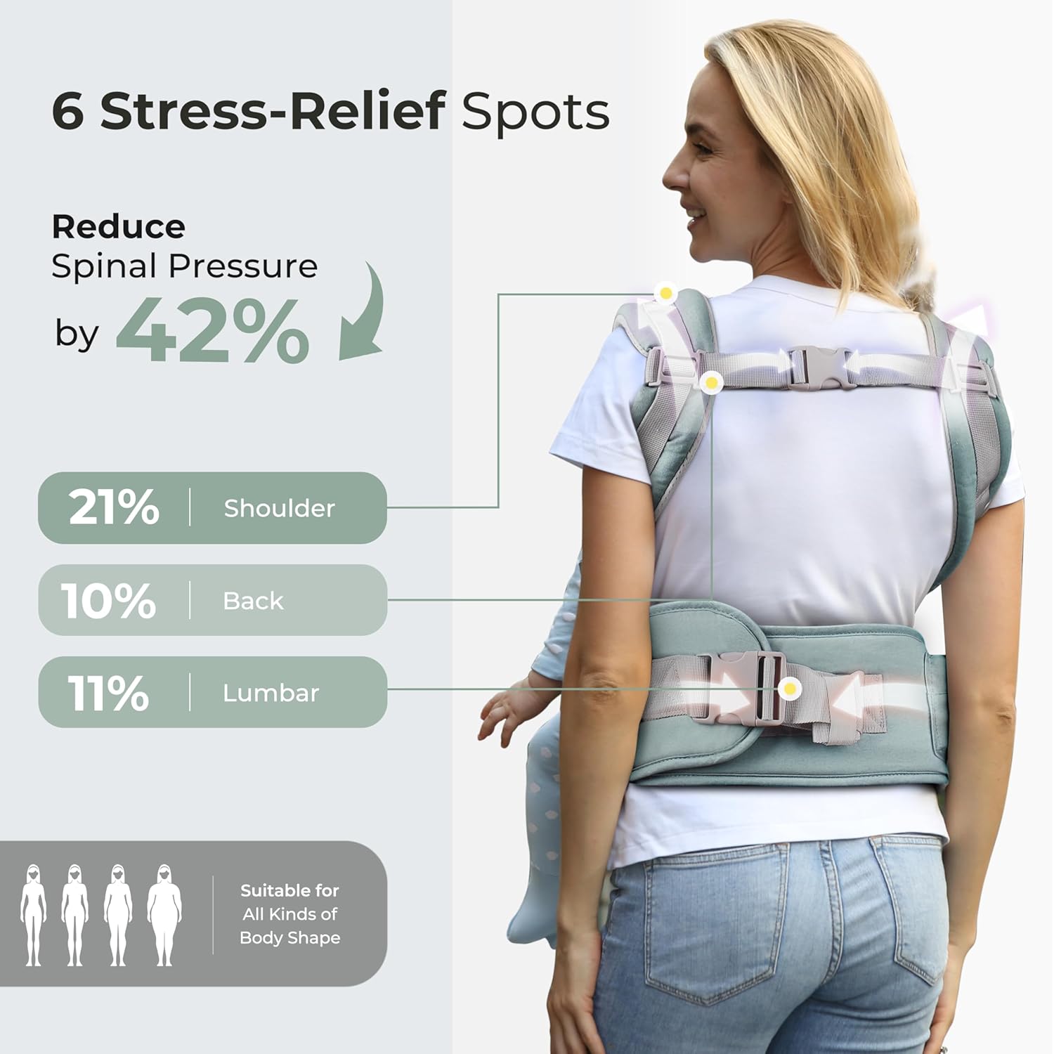 - ADJUSTABLE & WEIGHT-RELIEVING:Designed for all-day wear, this baby carrier features padded shoulder straps in an H-back design with height-adjustable buckles. The wide waistband and ergonomic support evenly distribute your baby’s weight, ensuring a perfect fit for all body types—whether you're petite or tall.