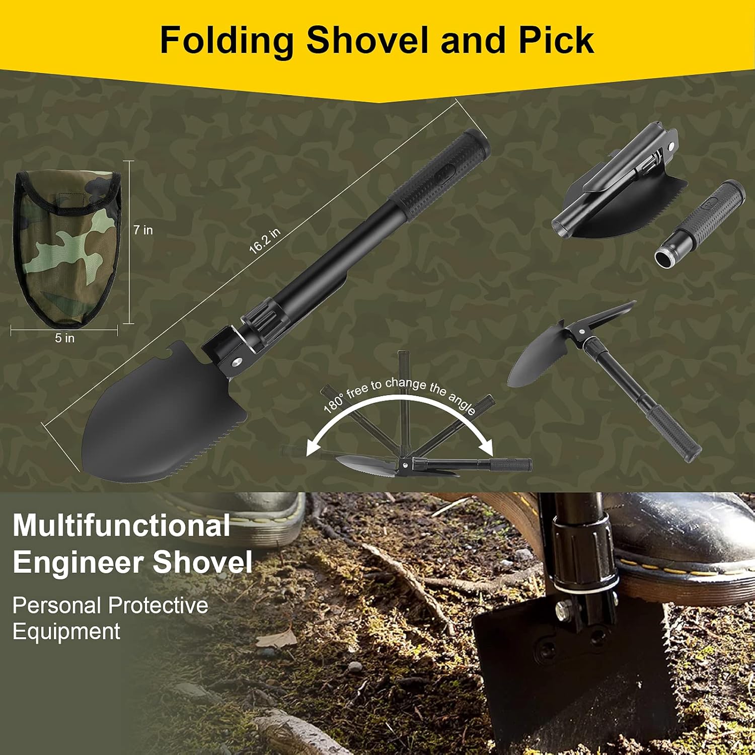 - 【High Quality Survival Gear for Any Emergency】This is a professional emergency kit that ensure you will be well-prepared under any emergencies, it contains various practical survival gear : 8 in 1 spoon and fork, 15 in 1 hatchet, bottle hanging buckle, hooks, compass, fire stone & scraper, flashlight, folding shovel and pick, multifunctional card, survival bracelet, tactical pen, wire saw. Meet your different needs in any emergency. Great gifts for men like outdoor activities.