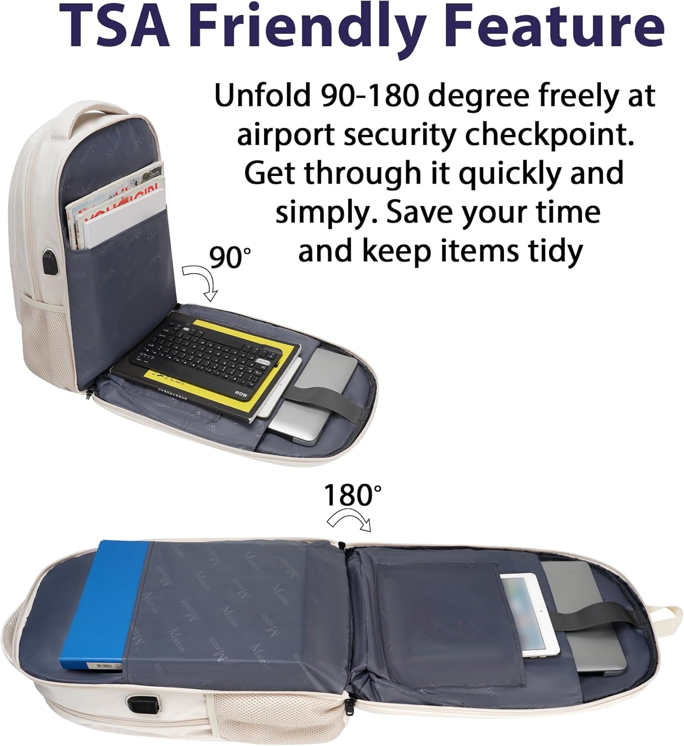 - TSA Approved Backpack: 17 inch laptop compartments' tsa function is designed for airplane flight travel. Large capacity laptop travel backpack can unfold 90 to 180 degree, making the large laptop bookbag get through airport security checkpoint more easily and quickly. This 17 in large laptop backpack is roomy and smart enough for college school, daily office work, weekend getaway, overnight trip, travel