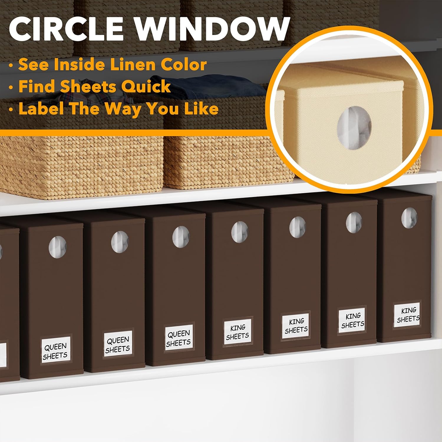 - CIRCLE WINDOW DESIGN - You can see the linen color clearly through the front circle window; This sheets organizer container is beautiful and modern that will fit any home style