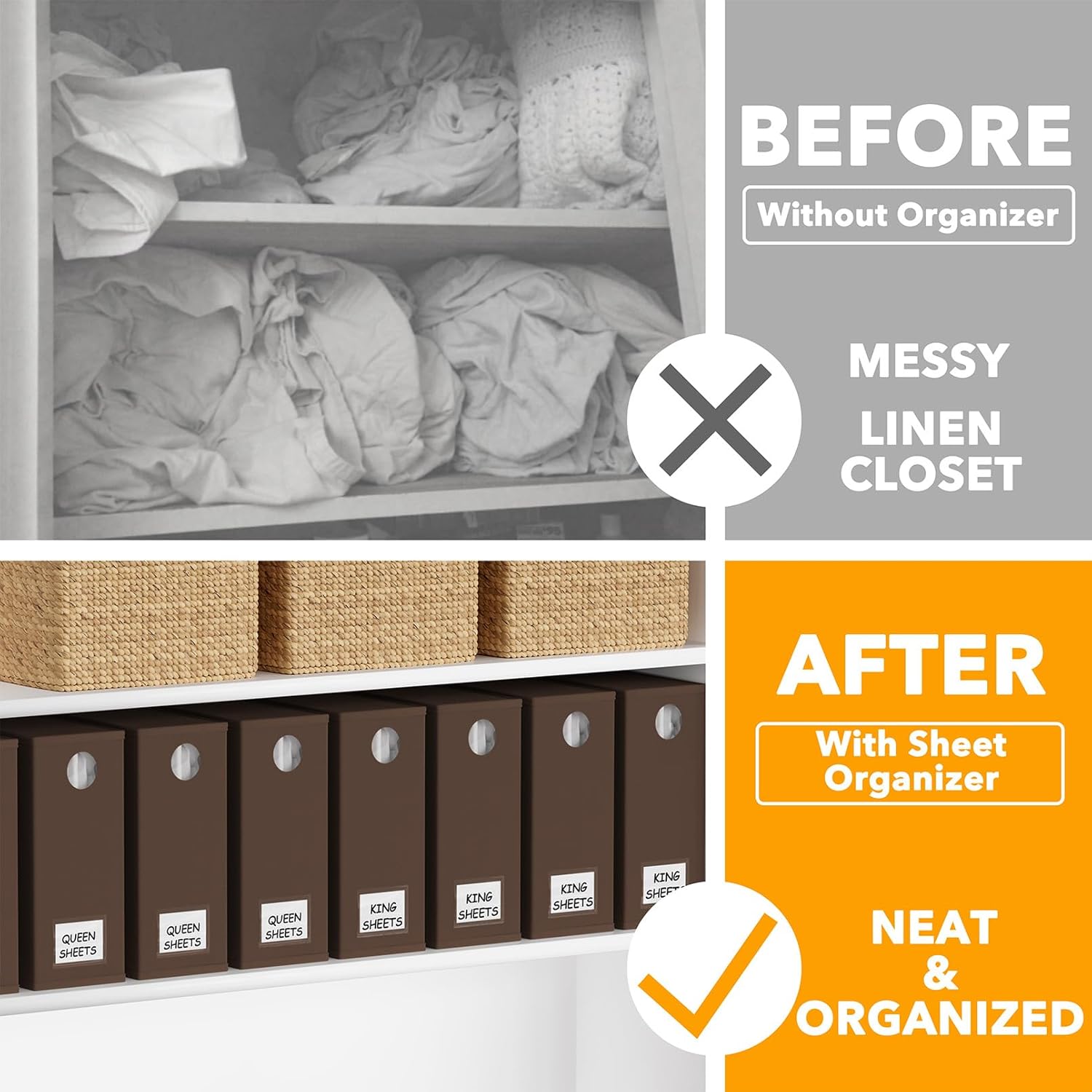- BROWN SHEET ORGANIZERS 8 PACK - Make your linen closet organized and beautiful with this foldable bed sheet fabric organizer; Each Storage Organizer SIZE: 5"W x 15"D x 12.8"H