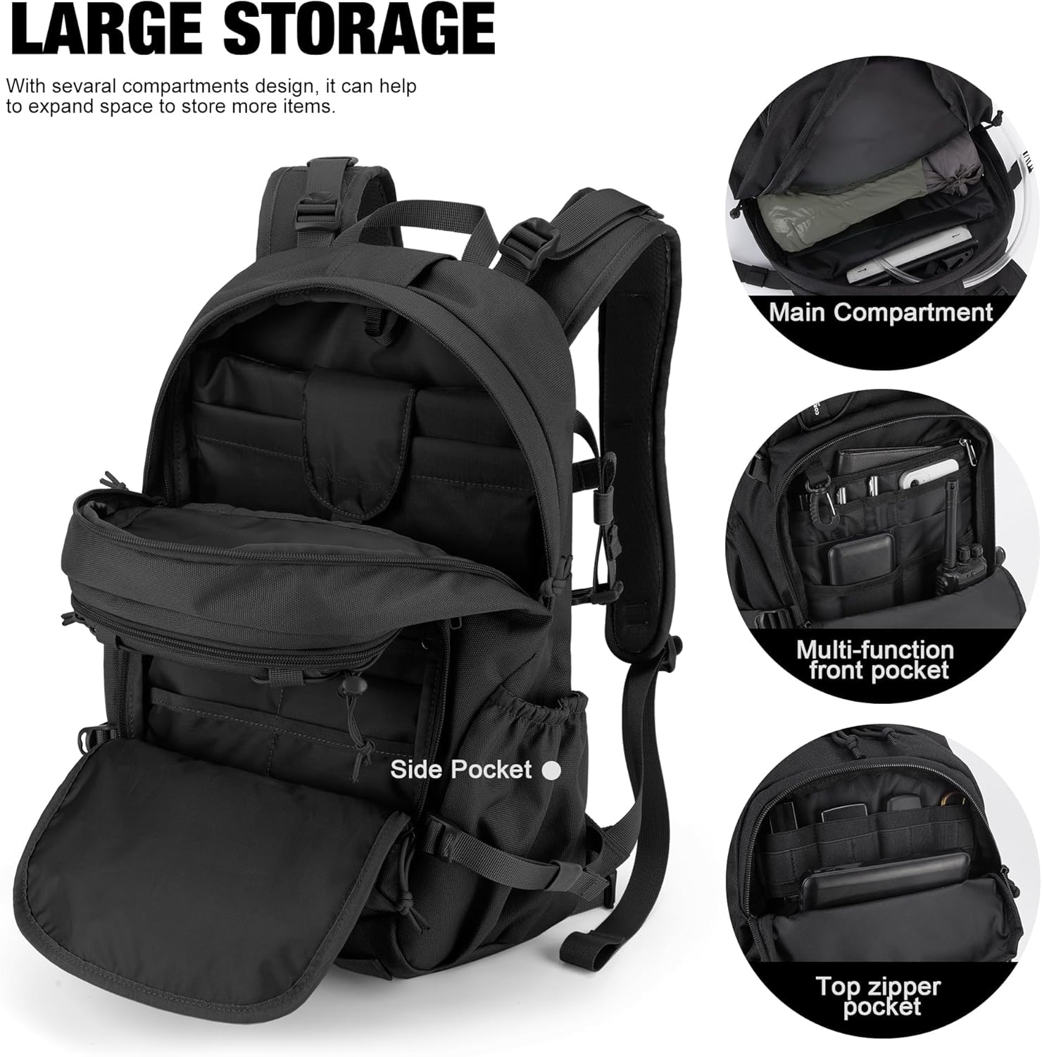 - Molle Design:This assault backpack can hang on additional tactical pouches or EDC gear as a goruck backpack,This backpack also has 4 webbing underneath to attach a bedroll, tent, or other hiking gear