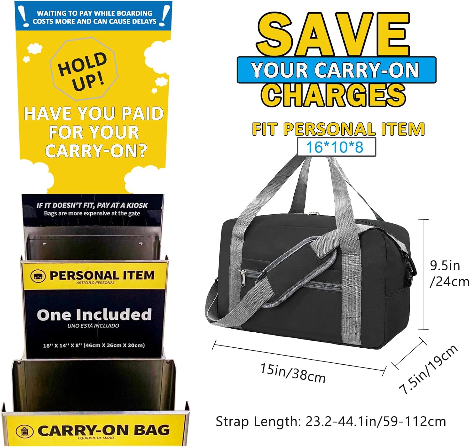 For Spirit Airlines Personal Item Bag 16x10x8 in Underseat Carry-on Luggage foldable Travel Duffle Bag for Airplanes(20L, Black)