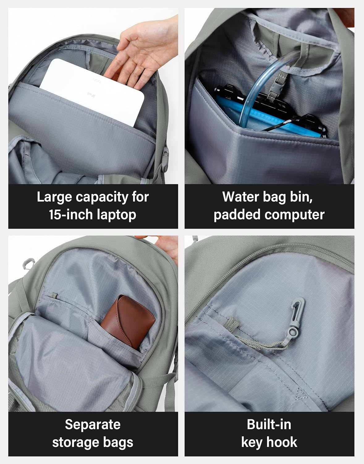 • Single-Sided Trekking Pole Attachment System and Hydration Port: The backpack is designed with a convenient trekking pole attachment system. The open front-end insert can accommodate various climbing gear and multifunctional expansion straps. The top of the backpack has a hydration port for easy use with a water bladder system, ensuring convenient hydration during outdoor activities. The interior includes a waterproof liner and a water bladder holder, which can also protect a padded laptop.