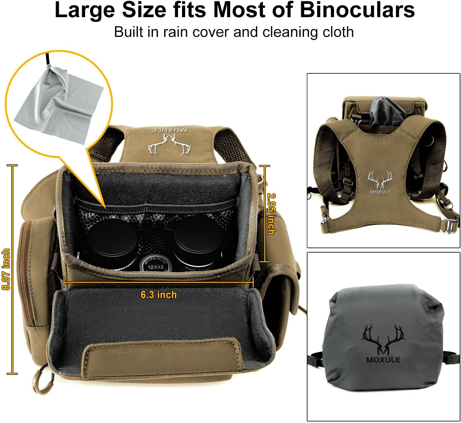 - Portable Multi Pockets: 1 main large compartment with 2 mesh storage pouches inside. 1 detachable rangefinder pouch and side pocket. 1 front phone pocket.1 mesh storage space at theback.1 rain cover pocket. The bottom of the binocular harness chest pack is equipped with molle straps.