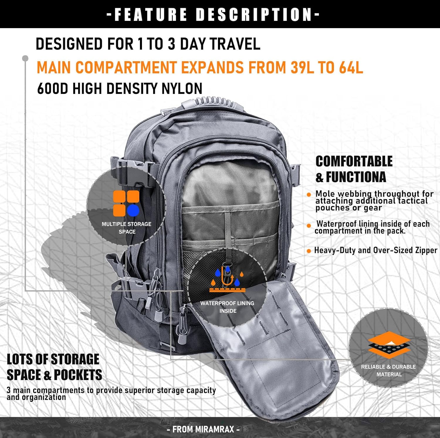 • 【Expandable Tactical backpack size】20 "; x 15" x 8" WHEN FULLY EXTENDED; Capacity: 39~64 Liters. Weight:2.7 lbs. It has multiple zipper pockets and compartments so you can easier organize and find yours belongs.