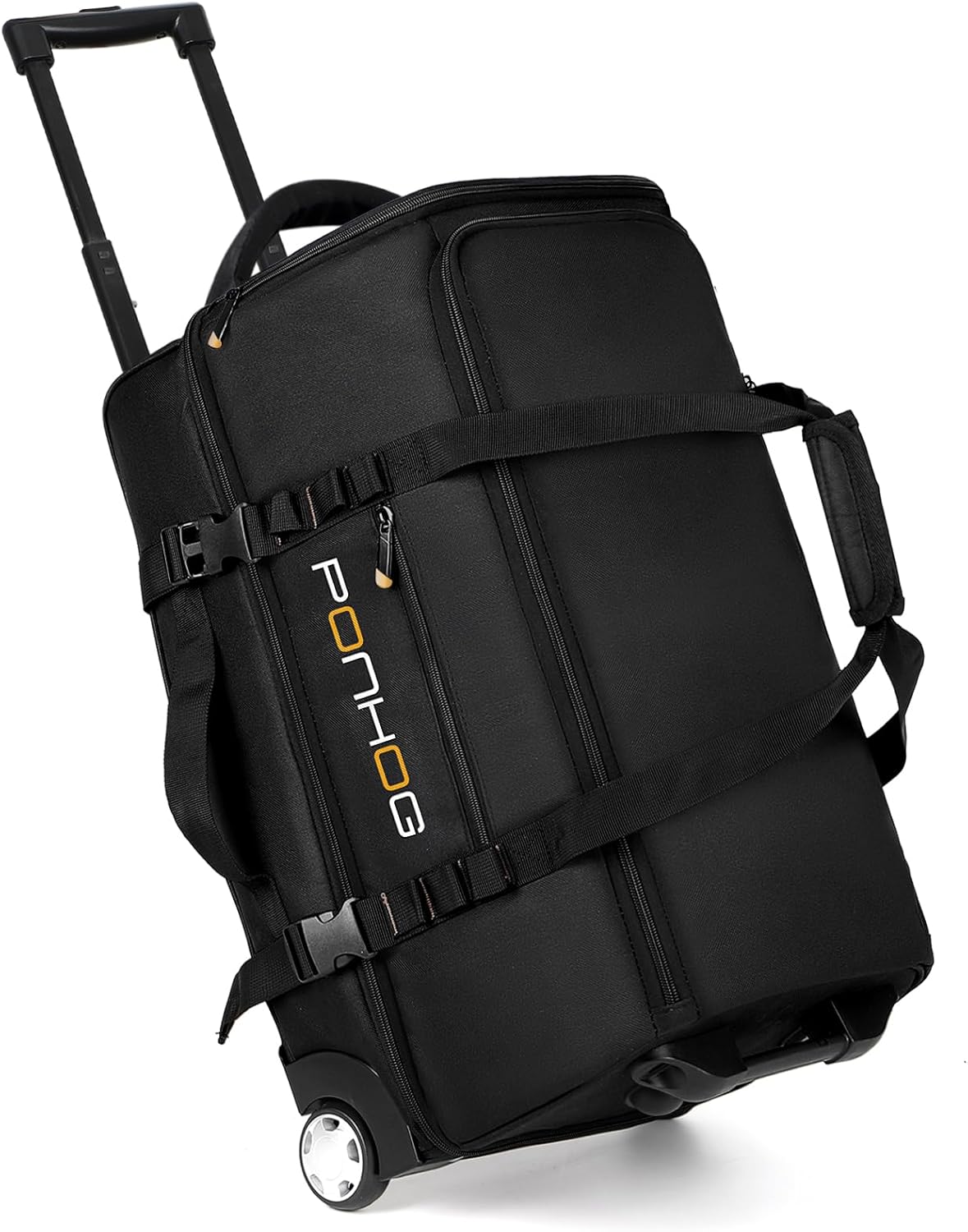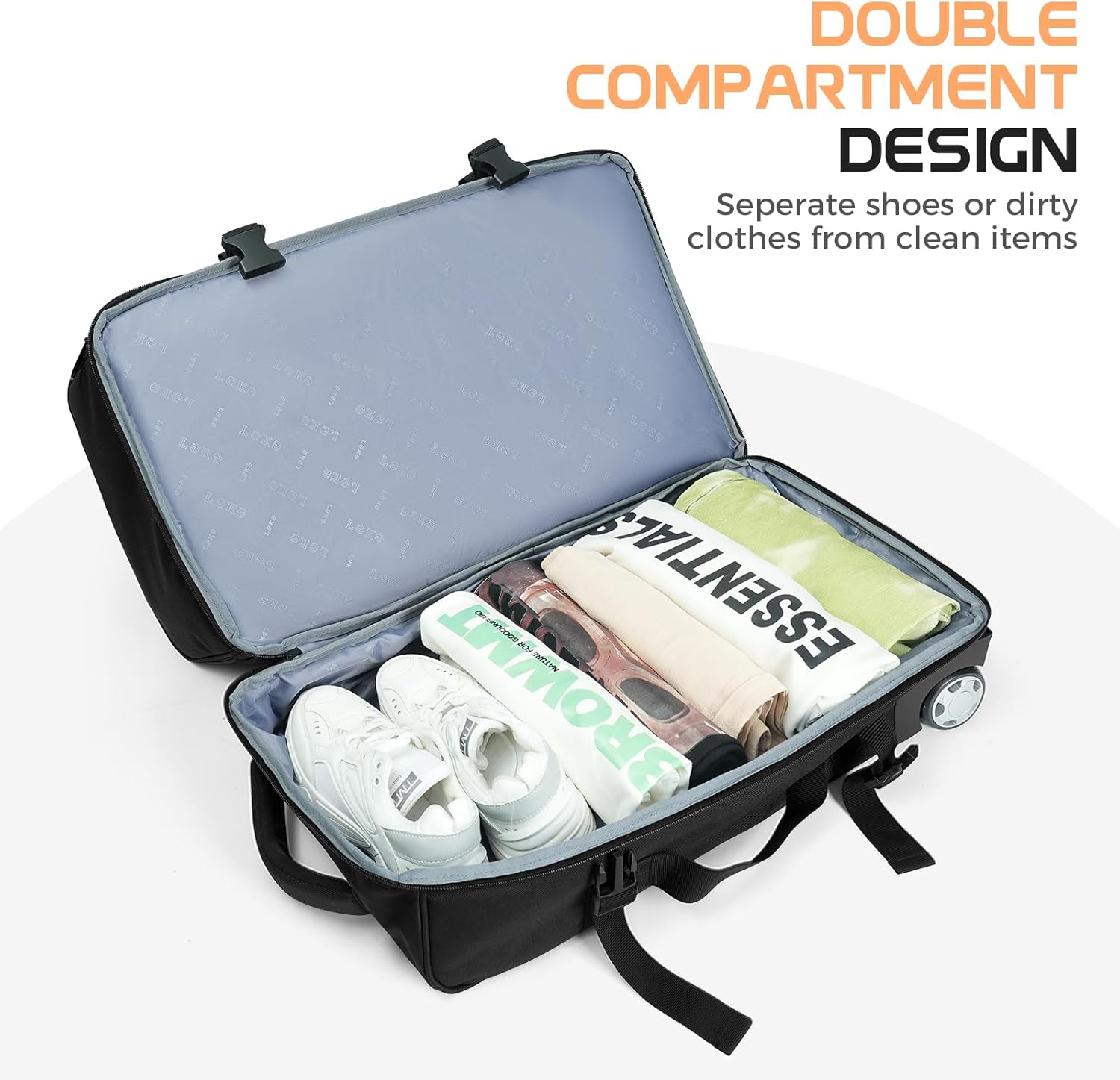 - CARRY MORE: Rolling duffle bag with two generous main compartments, Large U-shaped main opening for easy packing Clothing and a special side pocket for wet items or shoe ,Large enough to hold your 3-5 day trip essentials