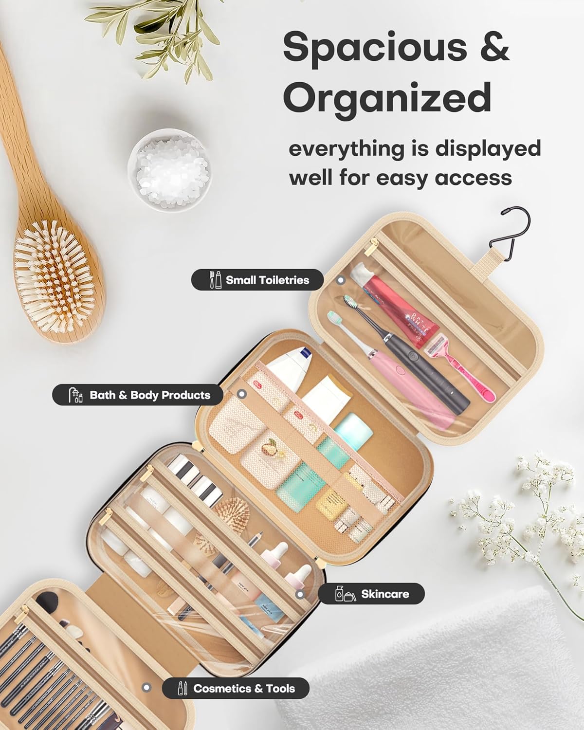 - EASY TO HANG ANYWHERE: Maximize your space with the HOTOR travel toiletry bag for women. Its premium metal hook allows for easy hanging on towel racks, coat hooks, or anywhere convenient. The retractable hook design keeps it neat and tidy when not in use. This space-saving toiletry bag keeps your toiletries and cosmetics easily accessible, making your travel routine a breeze.
