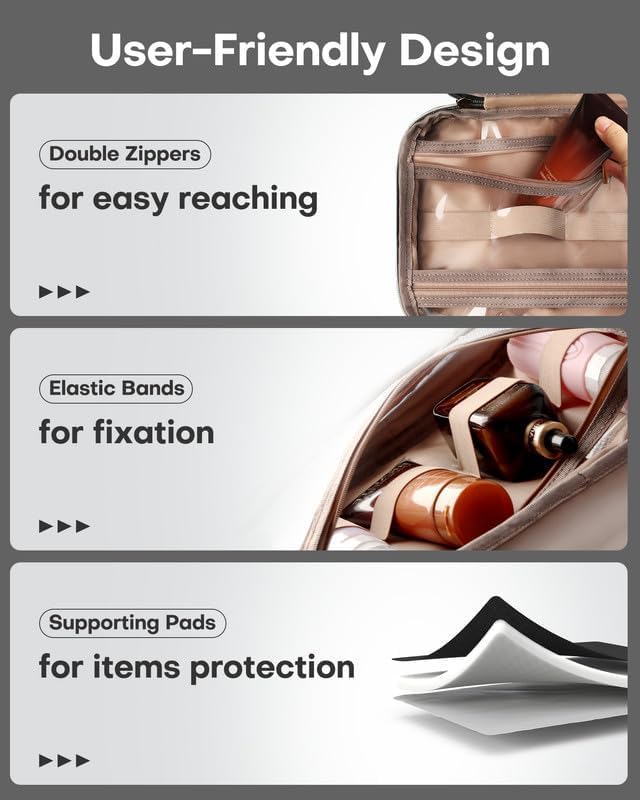 - EASY-TO-USE DESIGN: This hanging toiletry bag features two-way zippers, making it easy to open and close to quickly access your items. The elastic bands securely hold bottle-shaped items upright, preventing leaks or tipping. Moreover, the internal support pad helps maintain the bag's shape, providing extra protection for your belongings.