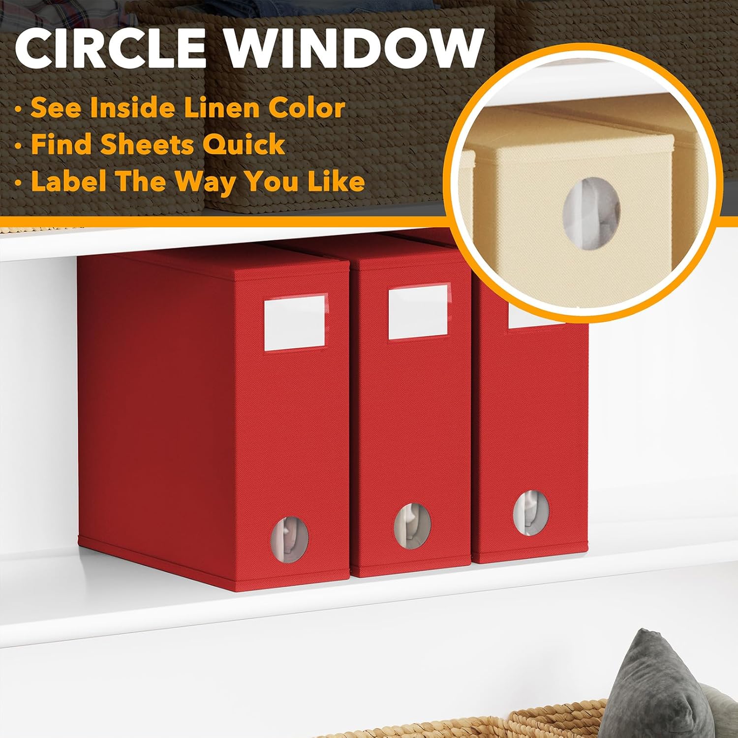 - CIRCLE WINDOW DESIGN - You can see the linen color clearly through the front circle window; This sheets organizer container is beautiful and modern that will fit any home style