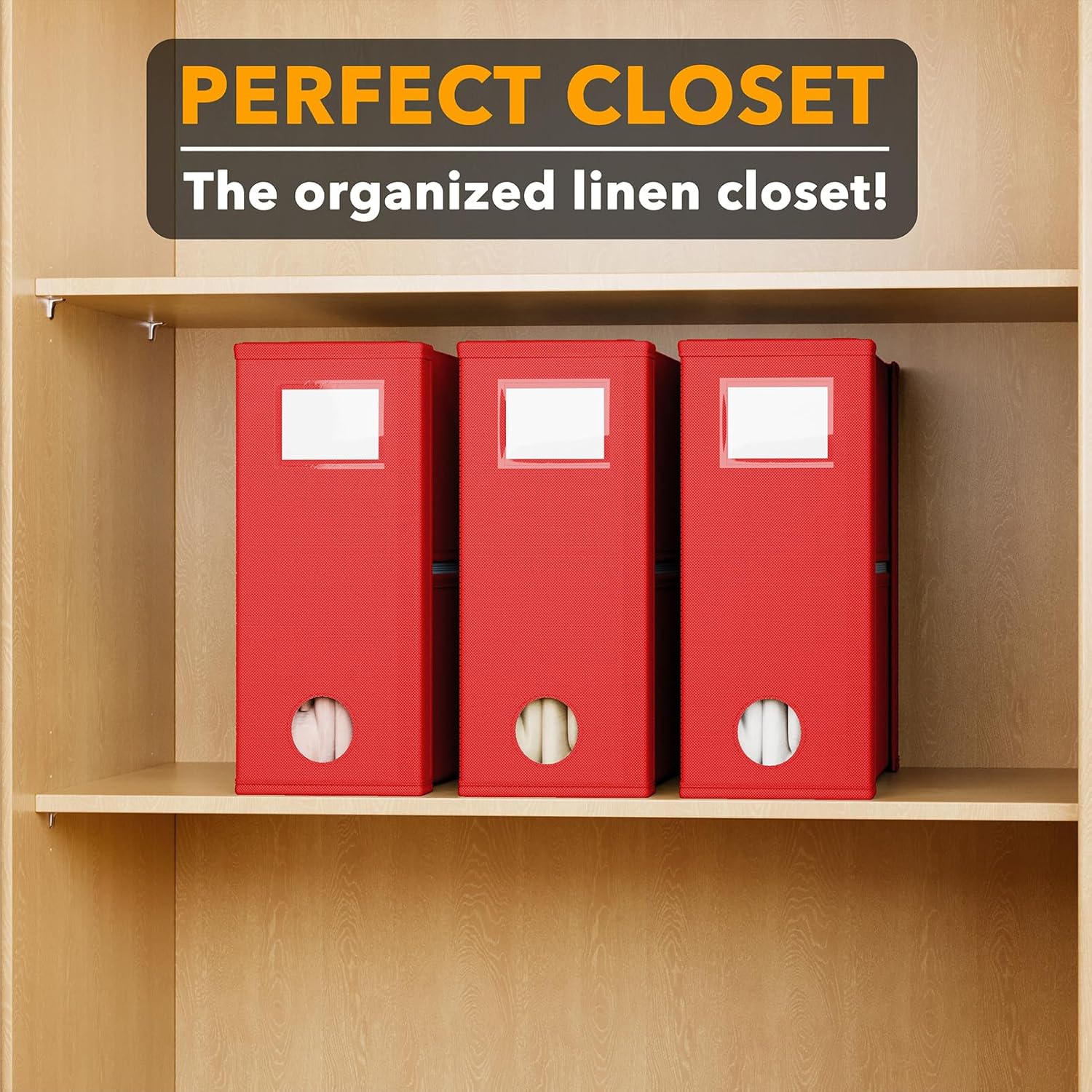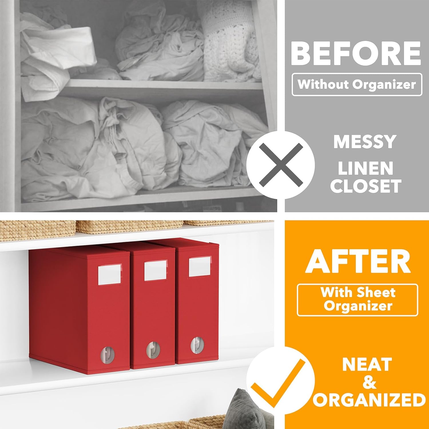 - RED SHEET ORGANIZERS 3 PACK - Make your linen closet organized and beautiful with this foldable bed sheet fabric organizer; Each Storage Organizer SIZE: 5"W x 15"D x 12.8"H