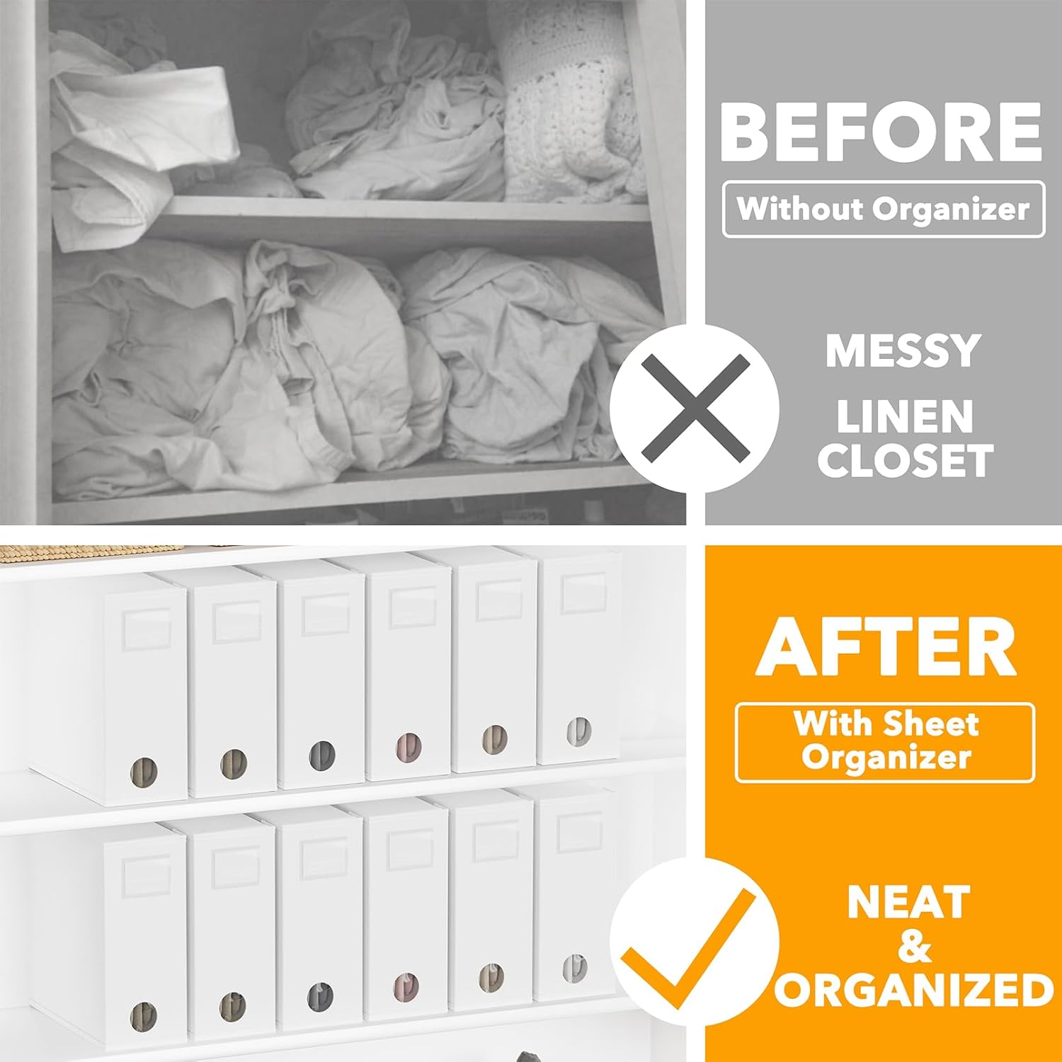 • WHITE SHEET ORGANIZERS 12 PACK - Make your linen closet organized and beautiful with this foldable bed sheet fabric organizer; Each Storage Organizer SIZE: 5"W x 15"D x 12.8"H