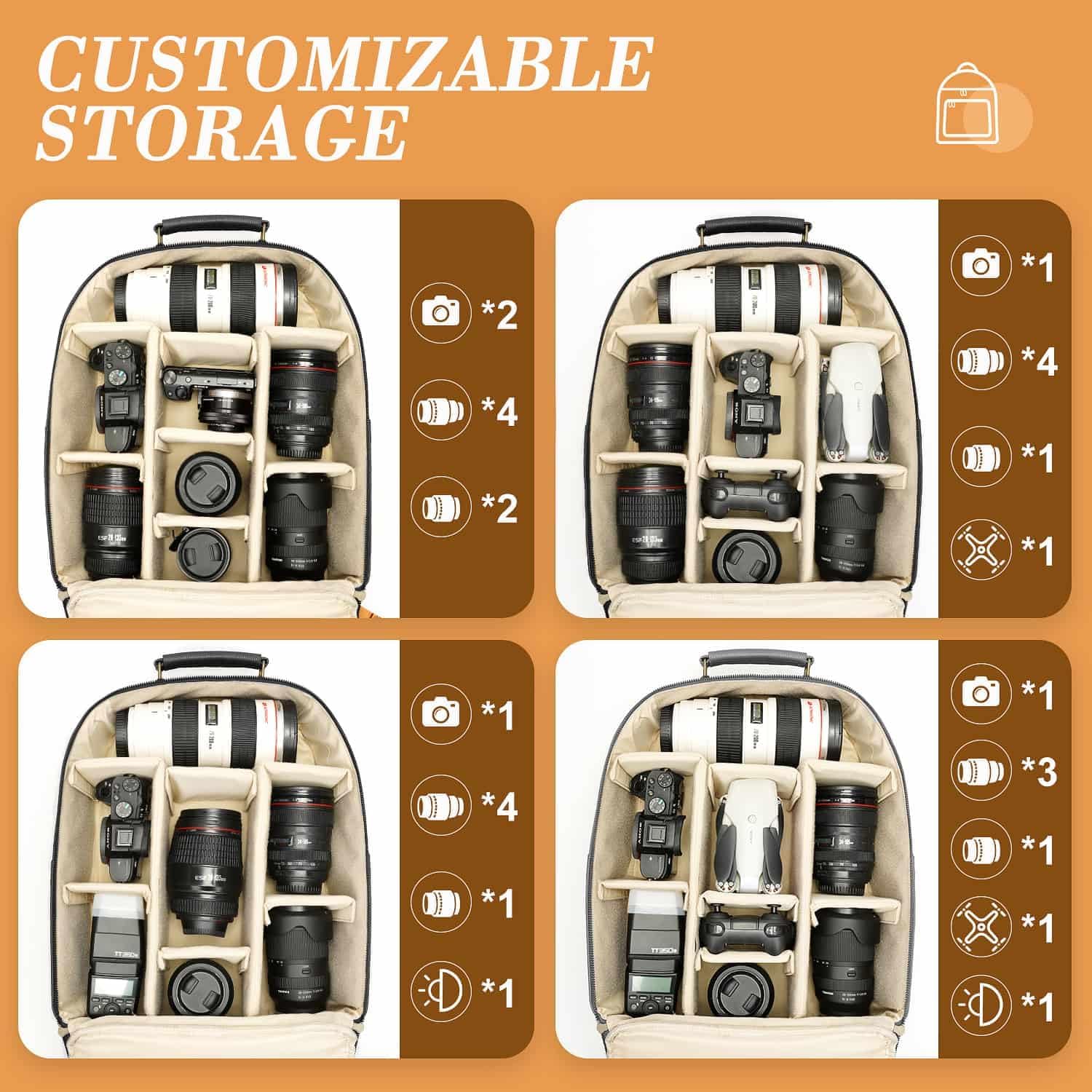 - Customized Storage Tailored to Your Needs: The heart of this backpack lies in its customizable camera compartment. Outfitted with six removable padded dividers, it offers unparalleled protection and organization for your camera gear. The adaptable interior allows you to tailor the space to fit various sizes of camera gear. And for times when photography isn't on the agenda, simply remove the dividers to transform the bag for drone carrying, travel, or everyday use