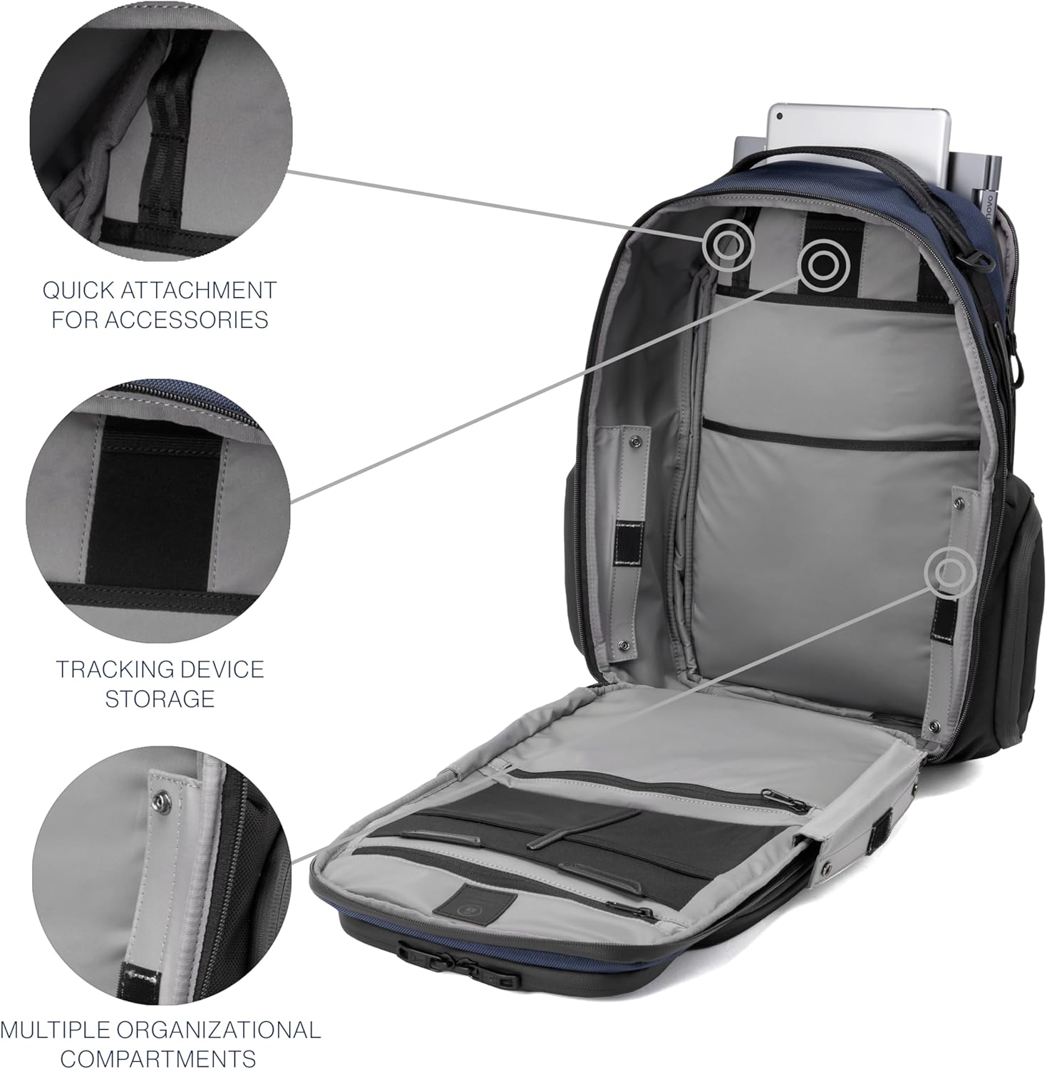- ORGANIZED STORAGE & TECH PROTECTION: Multiple compartments and a handy key leash keep essentials in check. Travelpro ID TheftBlock pocket, dedicated pocket for a tracking device, and discreet anti-theft pockets. Separate padded sleeves cushion your tablet and laptops up to 16β. Travelpro QuickSlip pocket with magnetic closure is secure but easy to access cellphone.