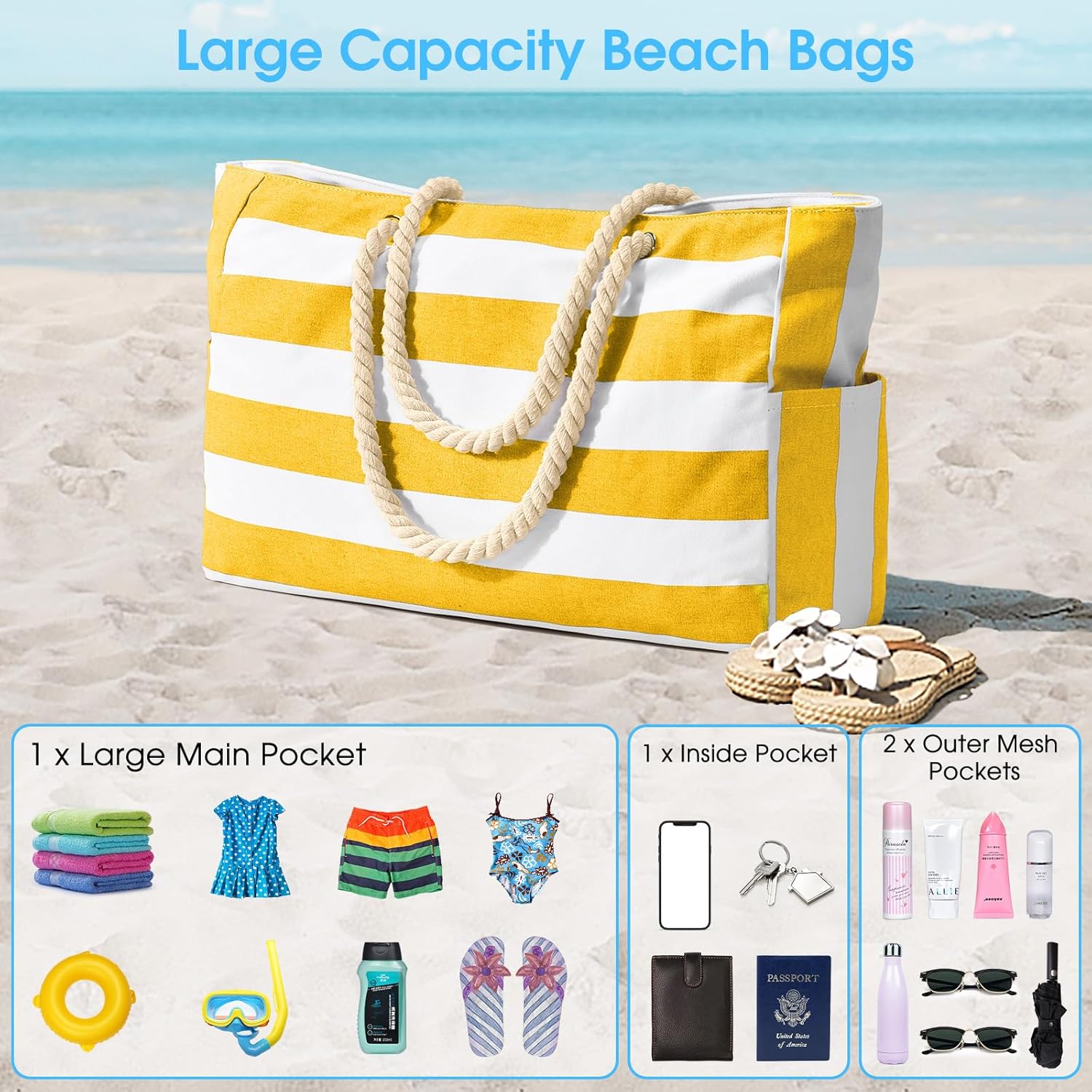 • Large Capacity: The beach bag tote can hold 4-6 large beach towels, extra clothes, shoes, sunblock, water bottles, beach toys, etc. Recommend for a beach vacation, tote bag, travel bag, duffel bag, swim pool bag, nurse bag, weekend bag, cruise must haves