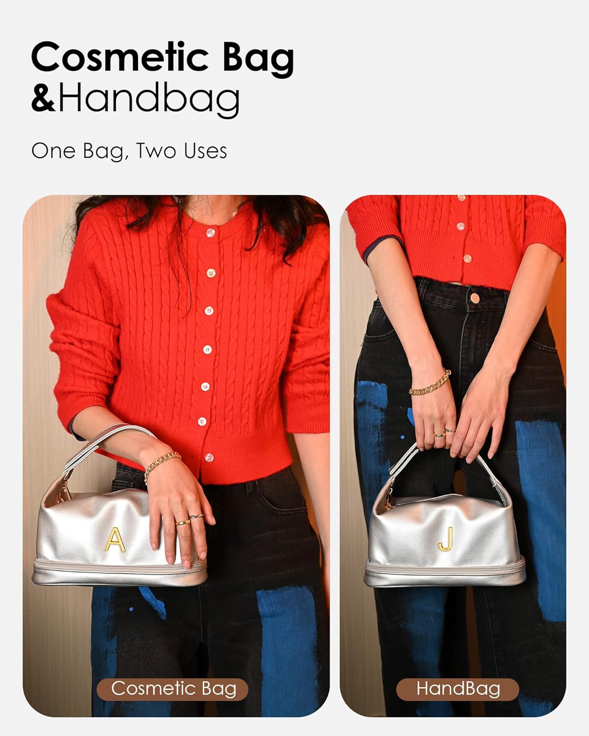 - 【Double-layer Design】The monogrammed makeup bags is double-layer with a unique design of upper and lower storage areas. The bottom compartment is great for storing cosmetics, eye shadows, makeup brushes, and other items. The top layer features a large opening for easy access, along with two small compartments for lipsticks and earrings.