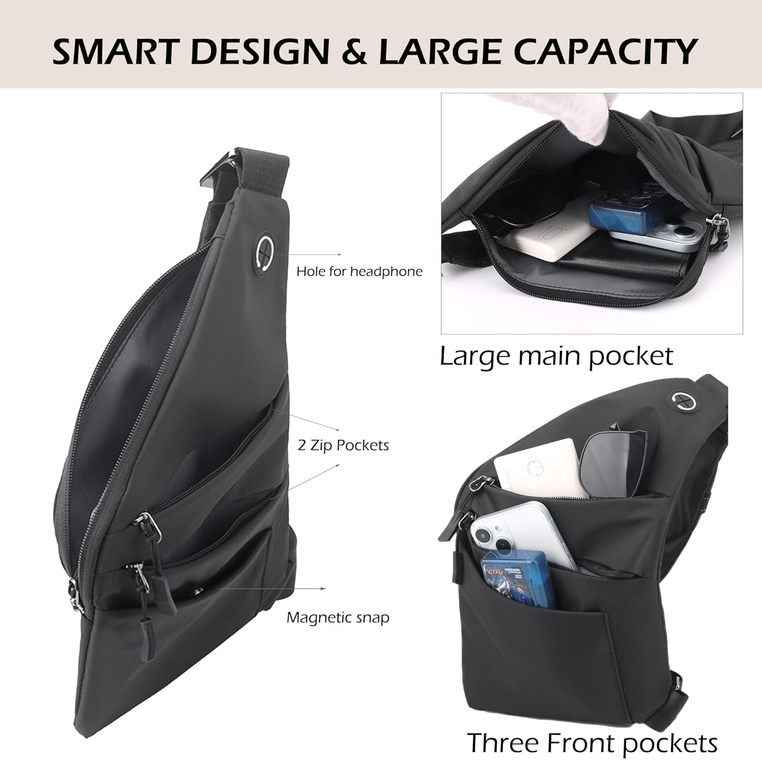 - MULTIFUNCTIONAL ORGANIZATION & PRACTICAL DESIGN - Large-capacity main compartment + front multi-zipper pockets design, easy to organize your cell phone, wallet, keys and other belongings, and headphone holes on the front pockets allow you to enjoy your music easily. Meet the diverse needs of daily commuting, traveling or leisure trips.