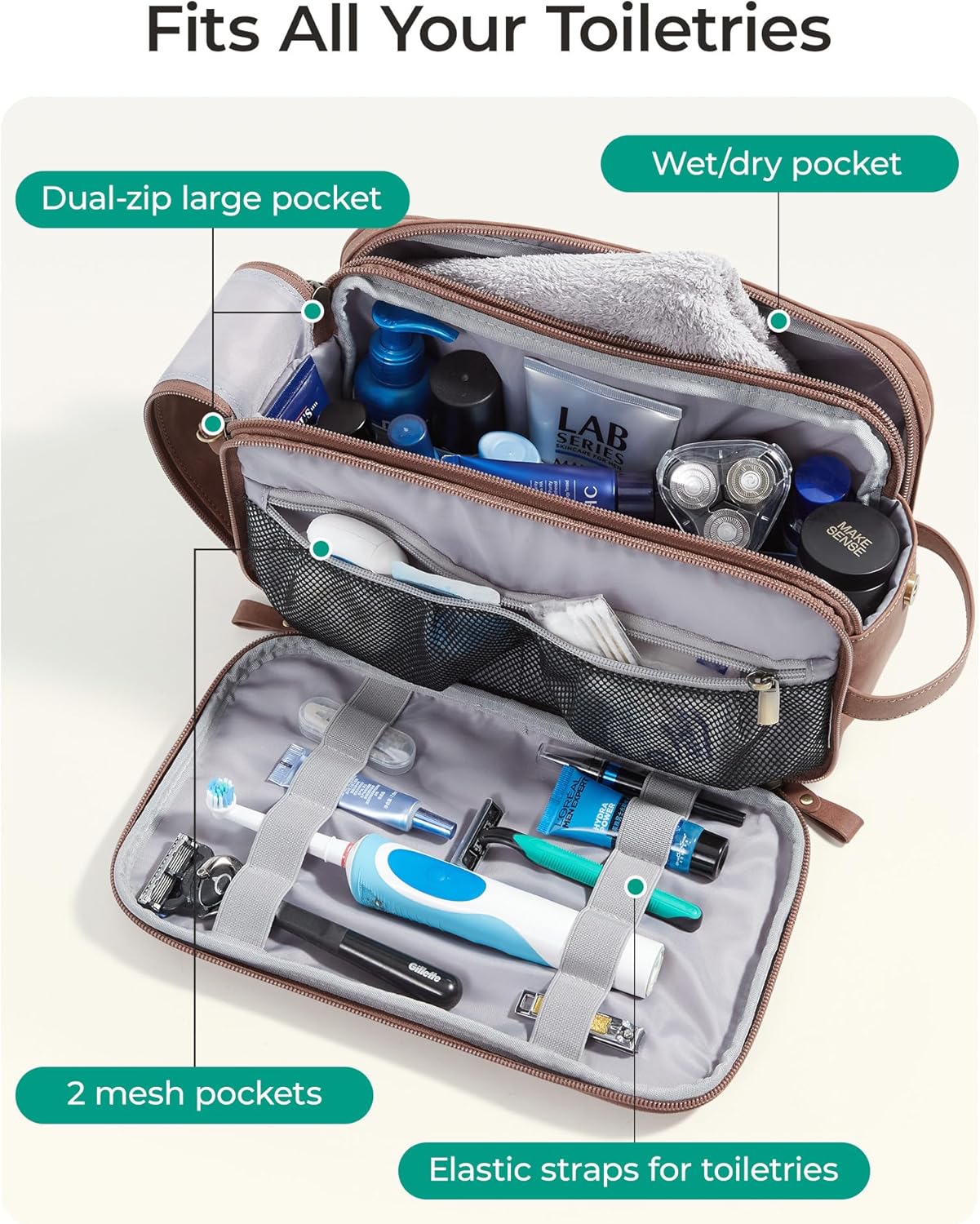 BAGSMART Toiletry Bag for Men, PU Leather Travel Bag for Toiletries, Dopp Kit Water Resistant Shaving Bag for Bathroom Shower-Dark Brown