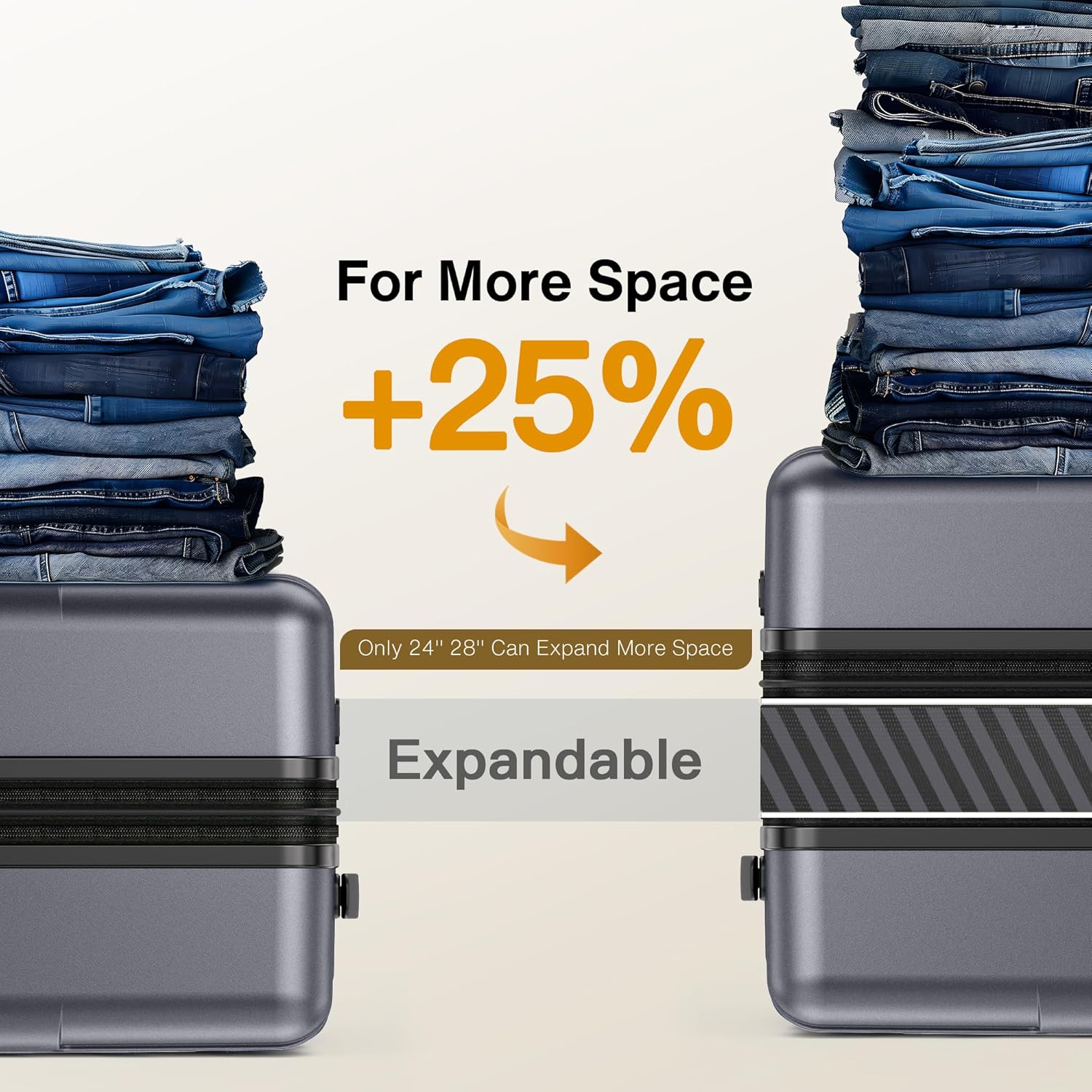 - Durable YKK Zipper & Expand 25%: Featuring YKK high-strength anti-burst zippers, rigorously tested for 100,000 cycles without failureβensuring smooth operation and zero risk of zipper jams or splits, even under extended travel use. Use the expandable zipper, the suitcase easily releases an additional 25% of its capacity, maximizing your packing flexibility (Only 24in & 28in).