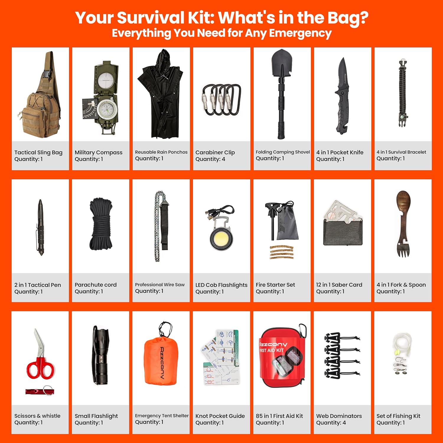 - 250 Survival Kit: All survival gear in this kit are essential, including a Multifunction Shovel, 12 in 1 Saber Card, 4 in 1 Survival Bracelet, 1 Set of Fishing Kit, Fire Starter, Modern Compass, Flashlight, Flashlights, Raincoat, Emergency Tent Shelter, First Aid Kit, Professional Wire Saw, Tactical Pen, 2 in 1 Fork & Spoon, 4 Web Dominators, 4 Climbing Hooks and more, which can meet your different needs.
