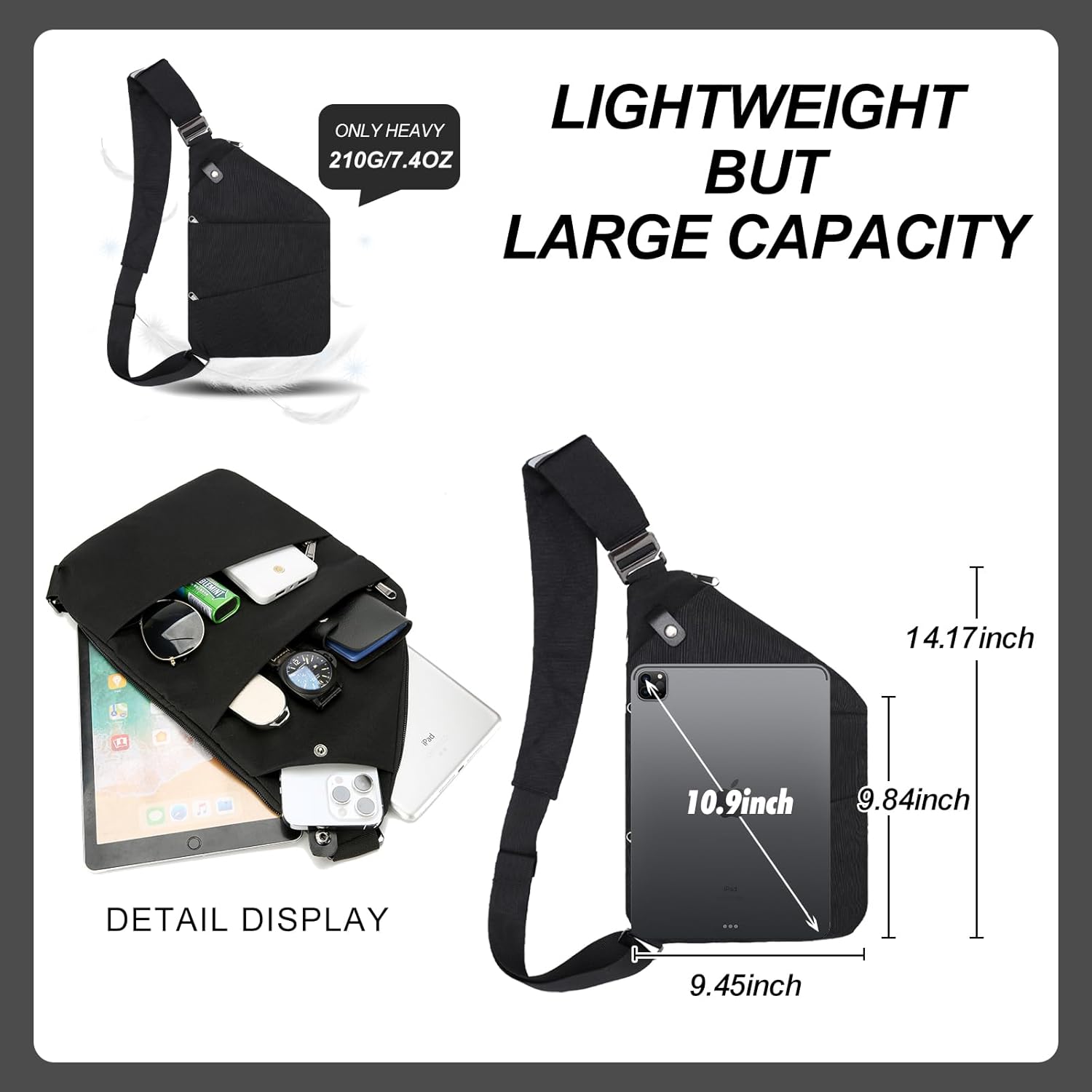 • 【Lightweight&Portable】High-quality nylon and canvas materials make this sling bag ultra-light(around 8oz).The large zippered pocket fits an 11-inch iPad,and the smart phone pocket is perfect for a 6.7-inch phone.It’s designed for effortless long-distance travel.