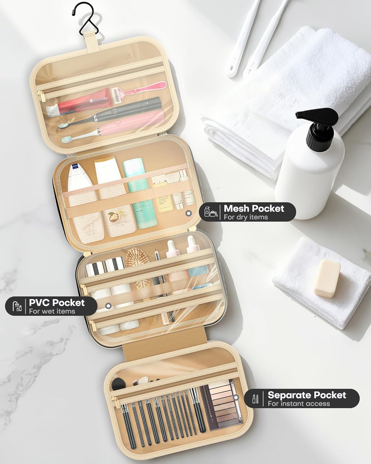 - STURDY HANGING HOOK: Equipped with a premium metal hook, HOTOR hanging toiletry bag for women can hang anywhere, allowing quick access to all your travel essentials. Hanging the bag keeps toiletries and cosmetics clearly visible, organized, and off crowded countertops, saving valuable space. When not needed, the hook can be neatly stored inside the bag.