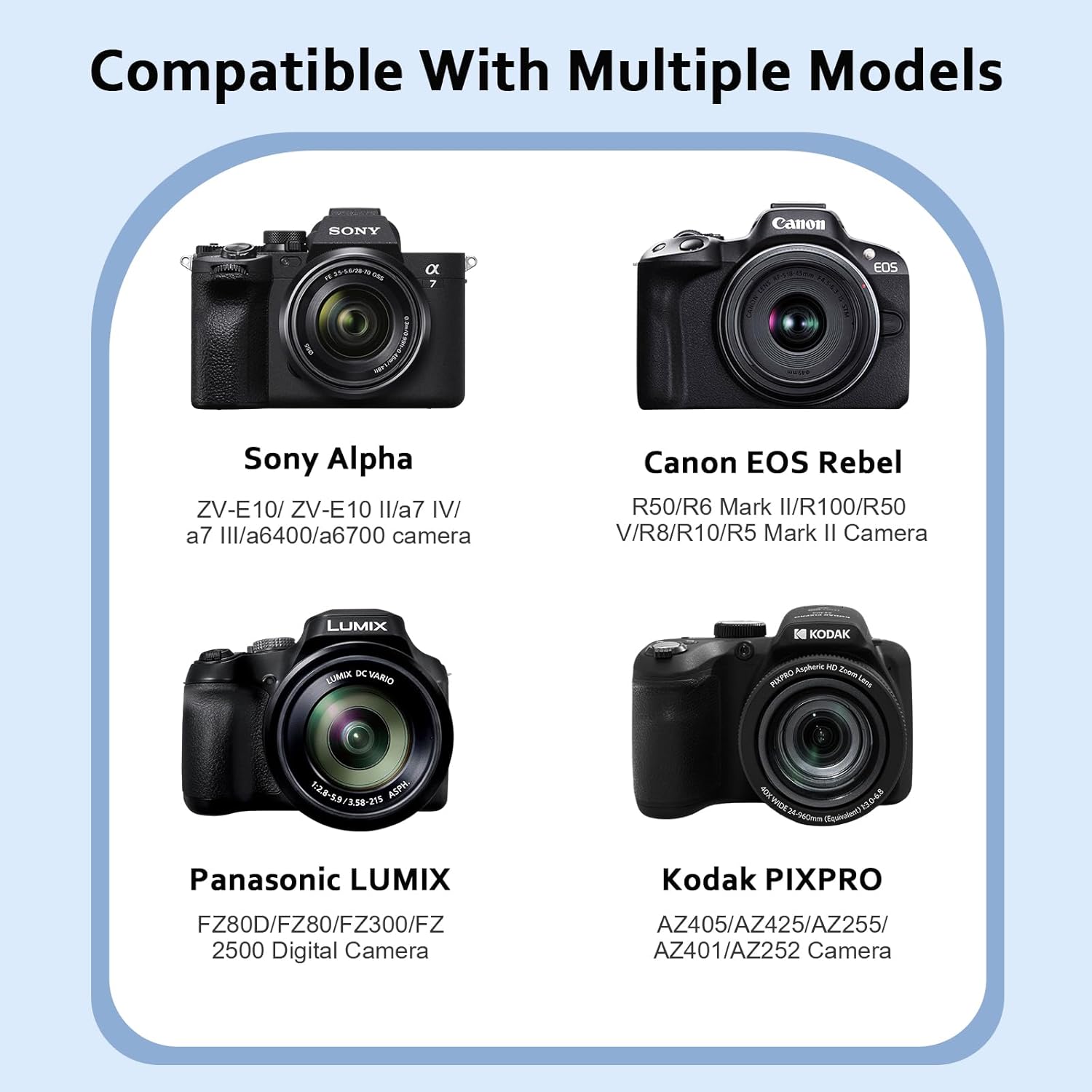- Perfect Fit:Specifically designed for the KODAK PIXPRO AZ405/AZ425/AZ255/AZ401/AZ252/AZ528, Canon EOS Rebel T7/R50/R6 Mark II/R100/R50 V/T6/R8/R10/R5 Mark II/RP/R7/5D Mark IV/SL3/R5/T100/80D/XTi/T7i/T6i/T5/T5i/6D Mark II/70D/XT/T3i/T3/SL2/R5 C/M50 Mark II/90D/M50 DSLR SLR Camera, Sony Alpha ZV-E10/a6400/7 IV/6700/a7 III/FX3/ZVE10 II/A6100/7R V/7C II/a6000 Camera, Nikon Z6 III/Z50 II/Z 6II/Z 8/Z 30/Z 7II/D7500/D850/D3500 Camera and Panasonic LUMIX FZ80D/G85 Camera